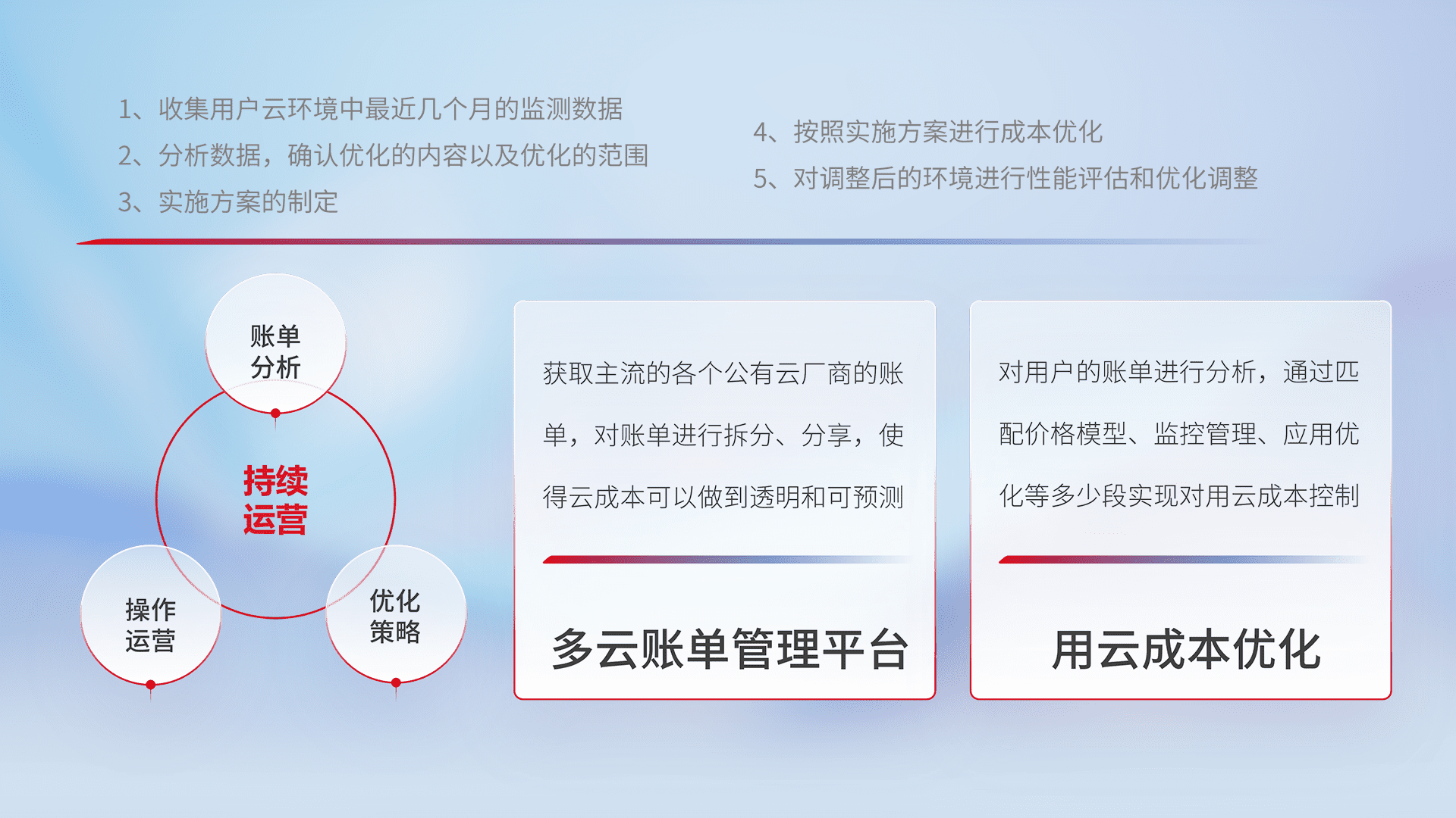 通过多云纳管,,以统一的资源数据模型把客户的云资源进行抽象和封装,,,进而实现对多云资源的统一操作,,,保障云资源管理的可靠性、、稳定性与可用性。。。量身定制化运维内容,,配置、、、、开发运维、、、补丁管理、、、、备份、、、监控、、认证和访问管理、、、、审计和日常巡检等,,保障在用云过程中的可靠度,,稳定度以及高可用率。。。